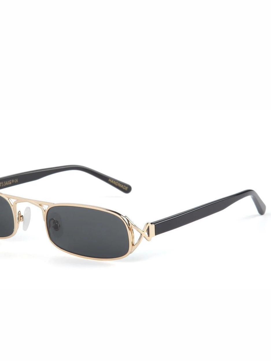 ゴールドのメタルフレームにブラックレンズとブラックのテンプル。