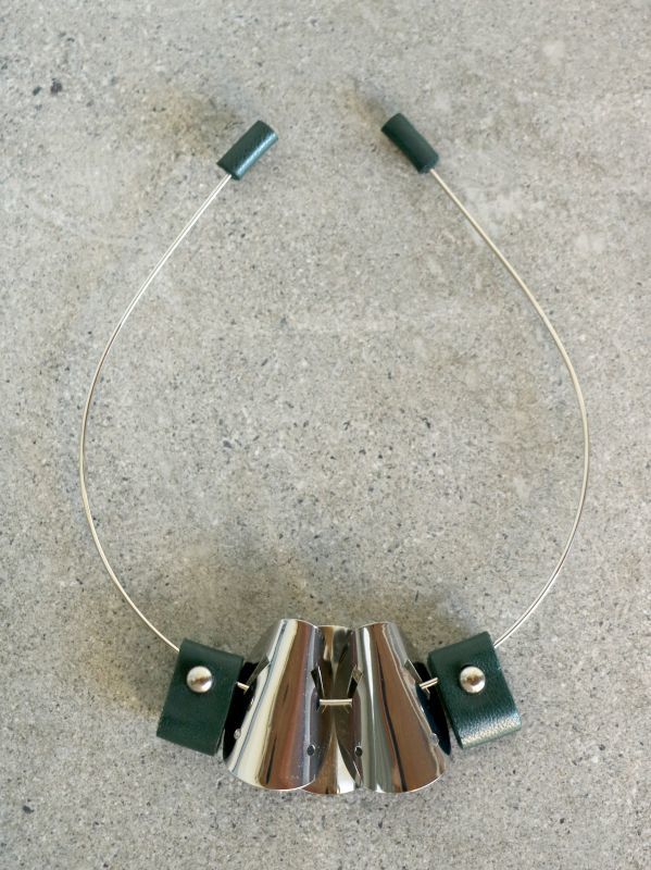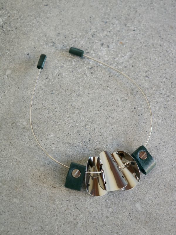 ダークグリーンカラーの本革とツヤのあるシルバーカラーのブラスメタルをミックスしたワイヤータイプのネックレスです。