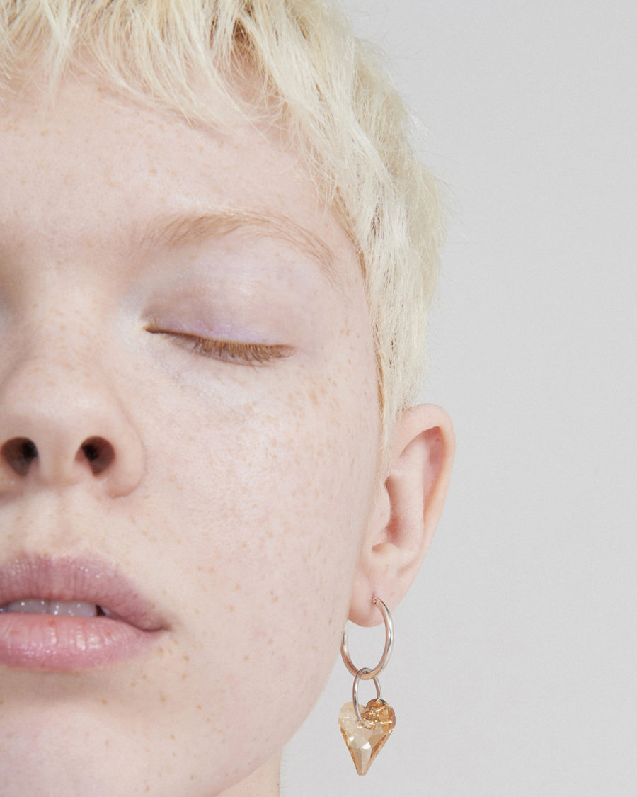 スワロフスキークリスタルのハートチャームが揺れる片耳用のシングルミニフープピアスです。