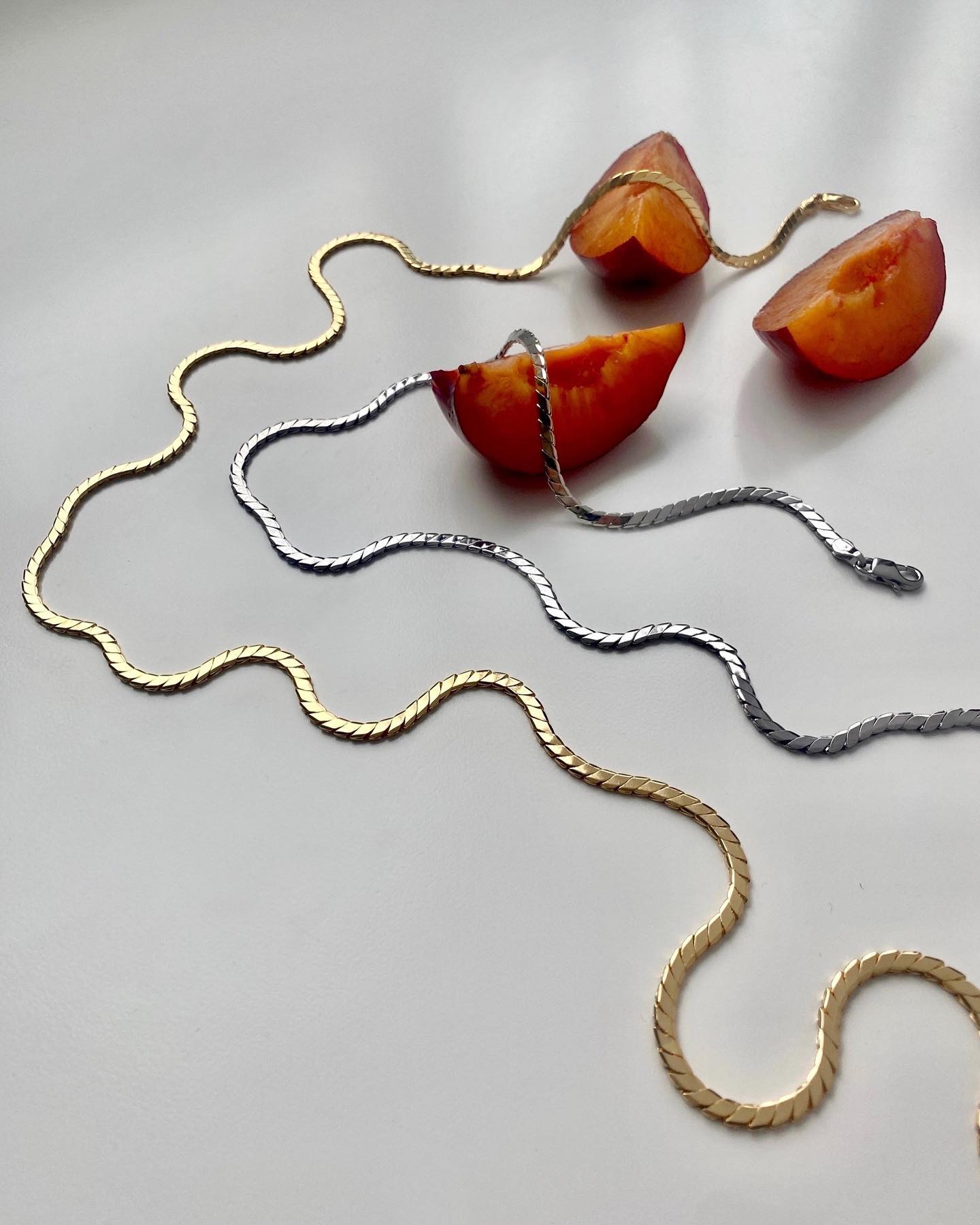 Enter the sleekest stream of high-shine perfection. This rare diagonal serpentine chain originates from a vintage deadstock haul at a secret supplier who's sadly no longer in operation. Rare as it is, this is an everyday piece to layer with or let shine solo. Available in 4 lengths.