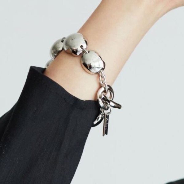 A bright stream of voluminous, polished metal forms suspend from a satin cord. Tie the cord once around the neck long or short, or wrap twice around with a bow tied front and centre.