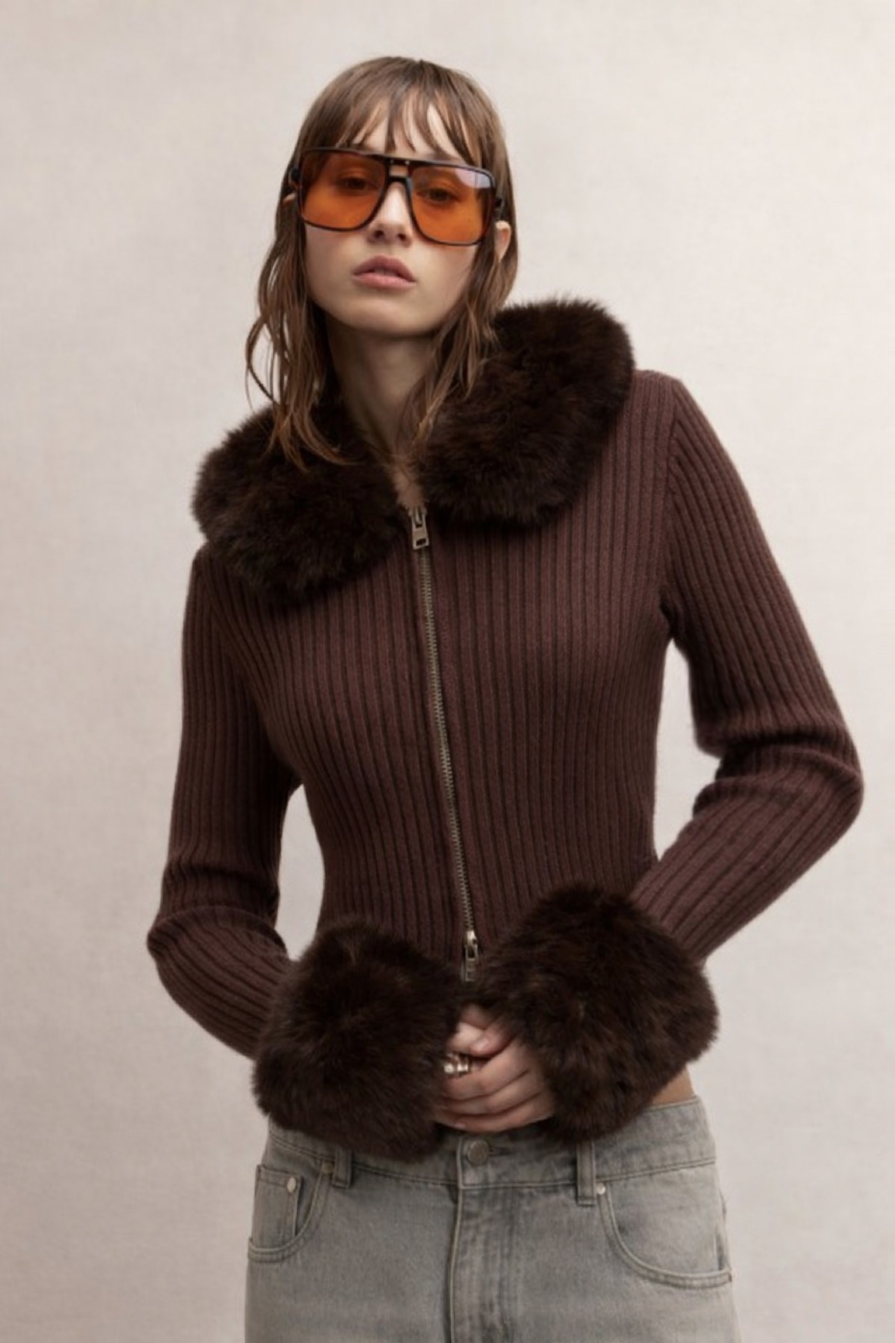 取り外し可能なふわふわのフェイクファーの襟とカフスのついた、リブニット素材で仕立てられたカーディガン。