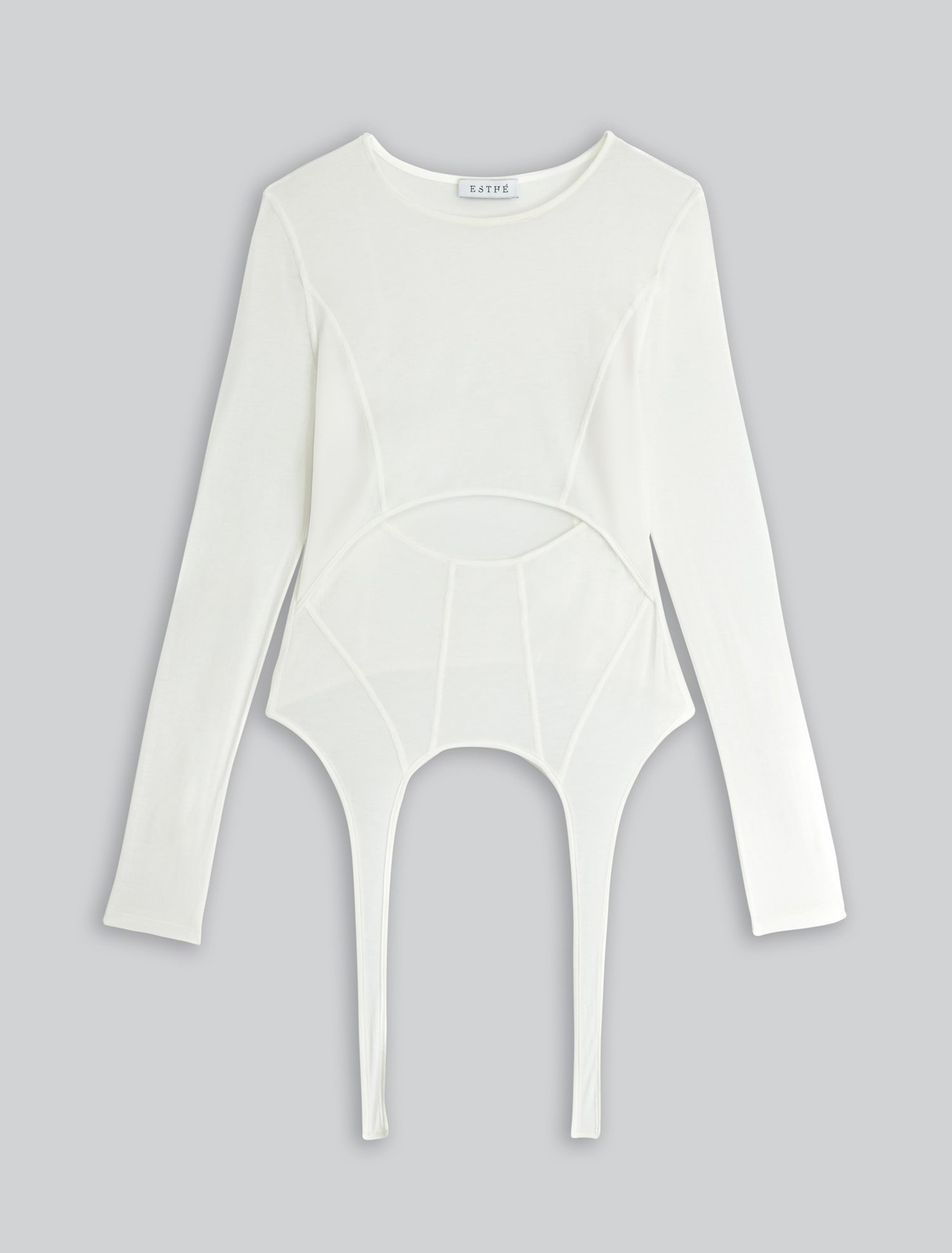 Explore elevated casual wear with this off-white top. Crafted with an elasticated fabric, it boasts a fitted, corset shape that offers a distinctive style. The crew neckline and long sleeves add a hint of modesty, while the front cut-out adds a playful twist. With semi-sheer construction and babylock seam lines, it’s unlined and can also be worn as a bralette. Confident and versatile, this top is a true wardrobe essential.