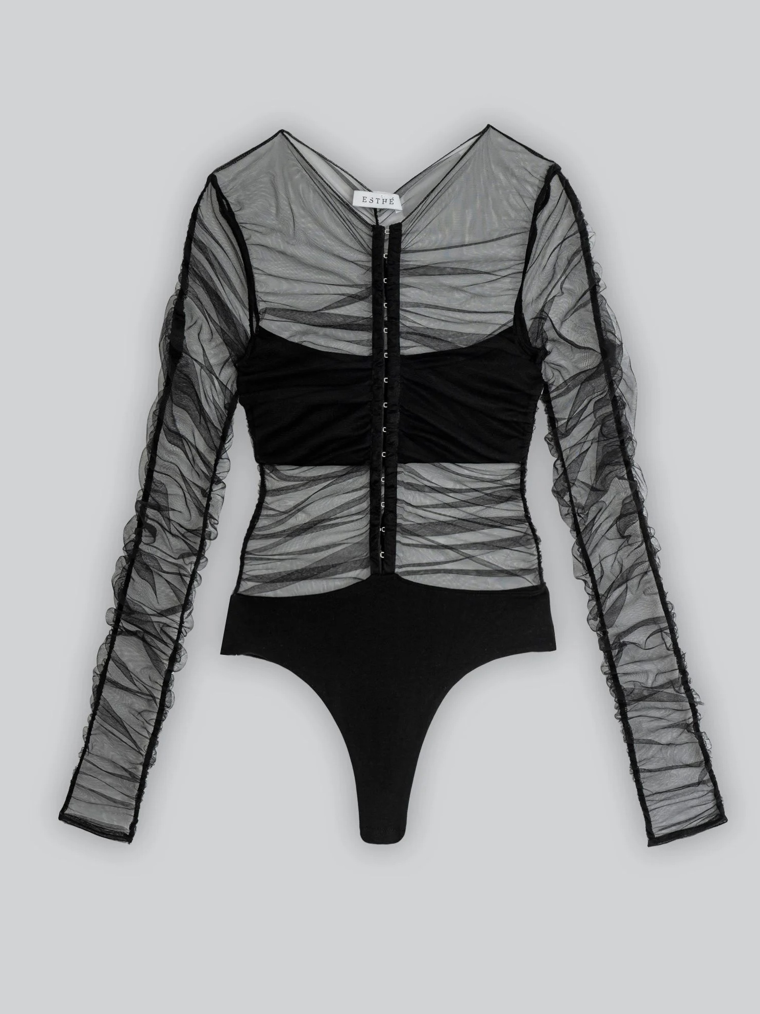 軽やかな伸縮性のあるシアーチュール素材で作られたボディースーツ