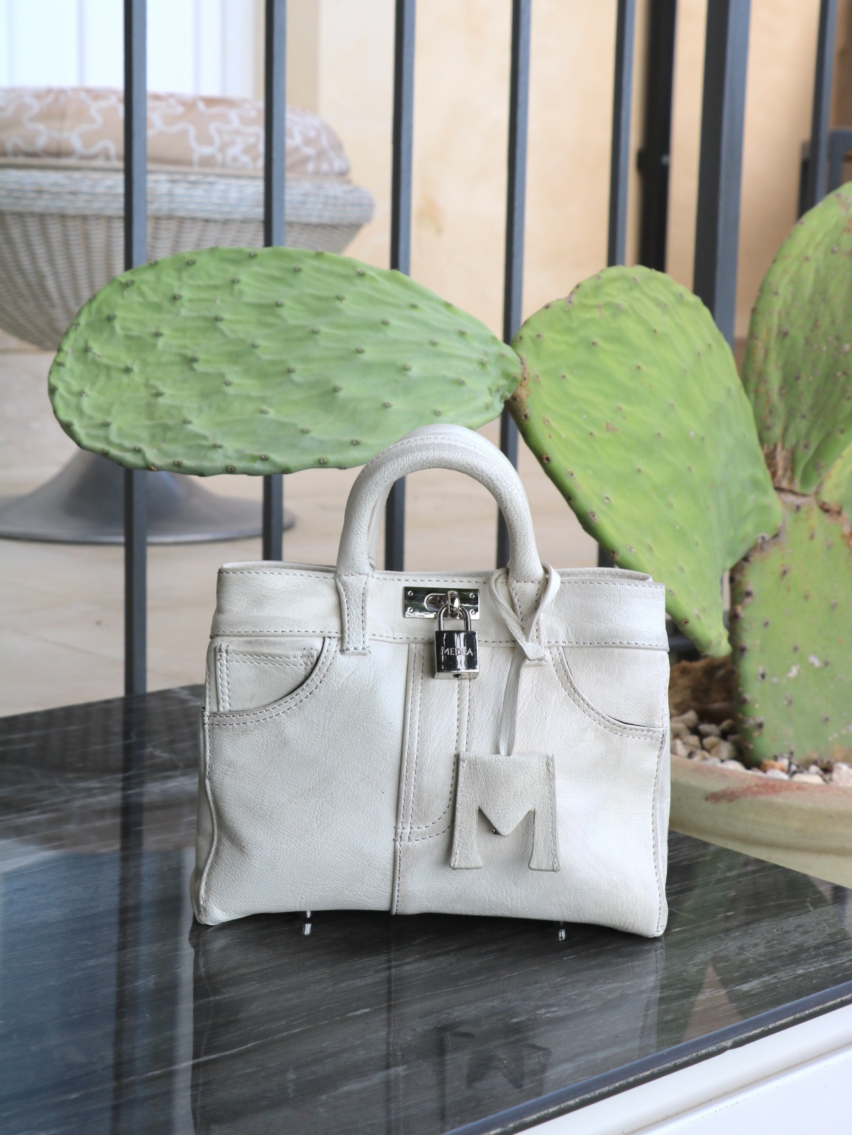 2ハンドルに、ロゴが彫刻されたロックキー付き。ハンドルについているレザーのMチャームに鍵が隠されています。