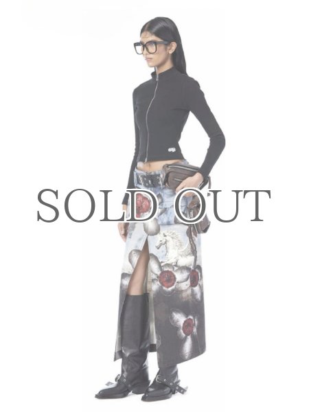 A cargo-style long skirt made from medium-weight denim, featuring an original print of unicorns and flowers for a bold contrast. The relaxed silhouette includes dimensional front pockets and a front slit, offering both comfort and style.