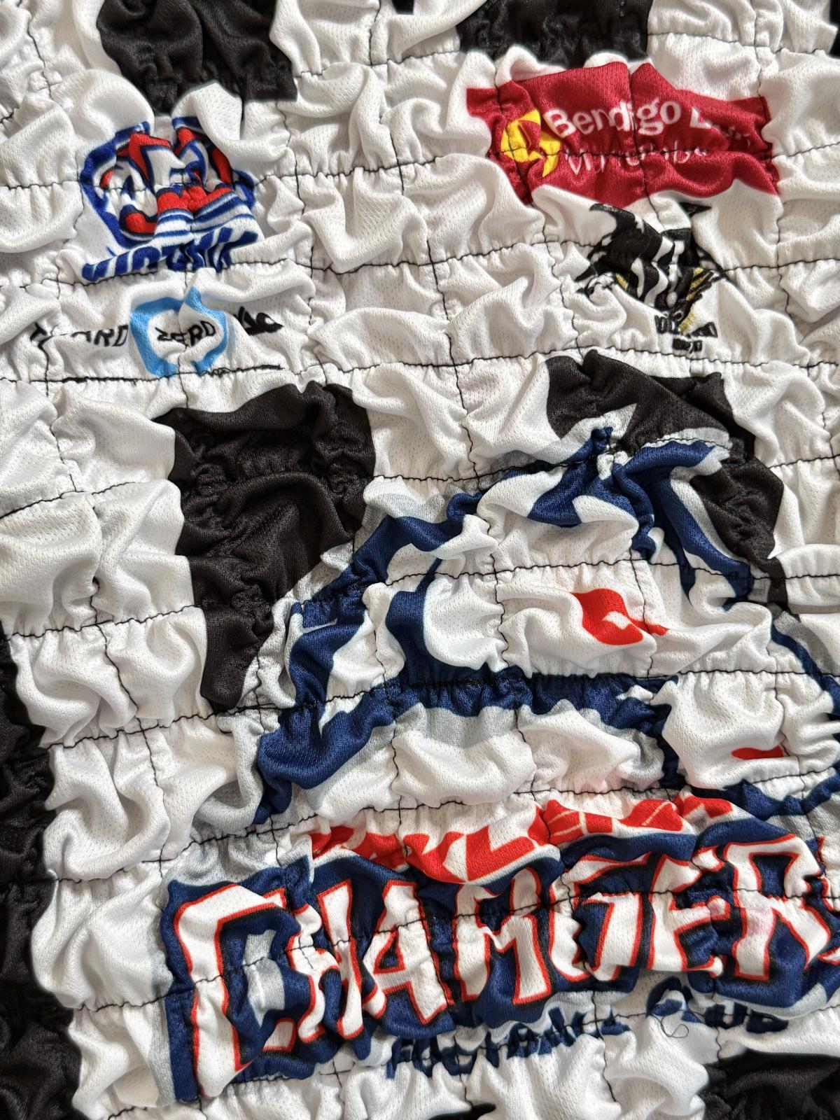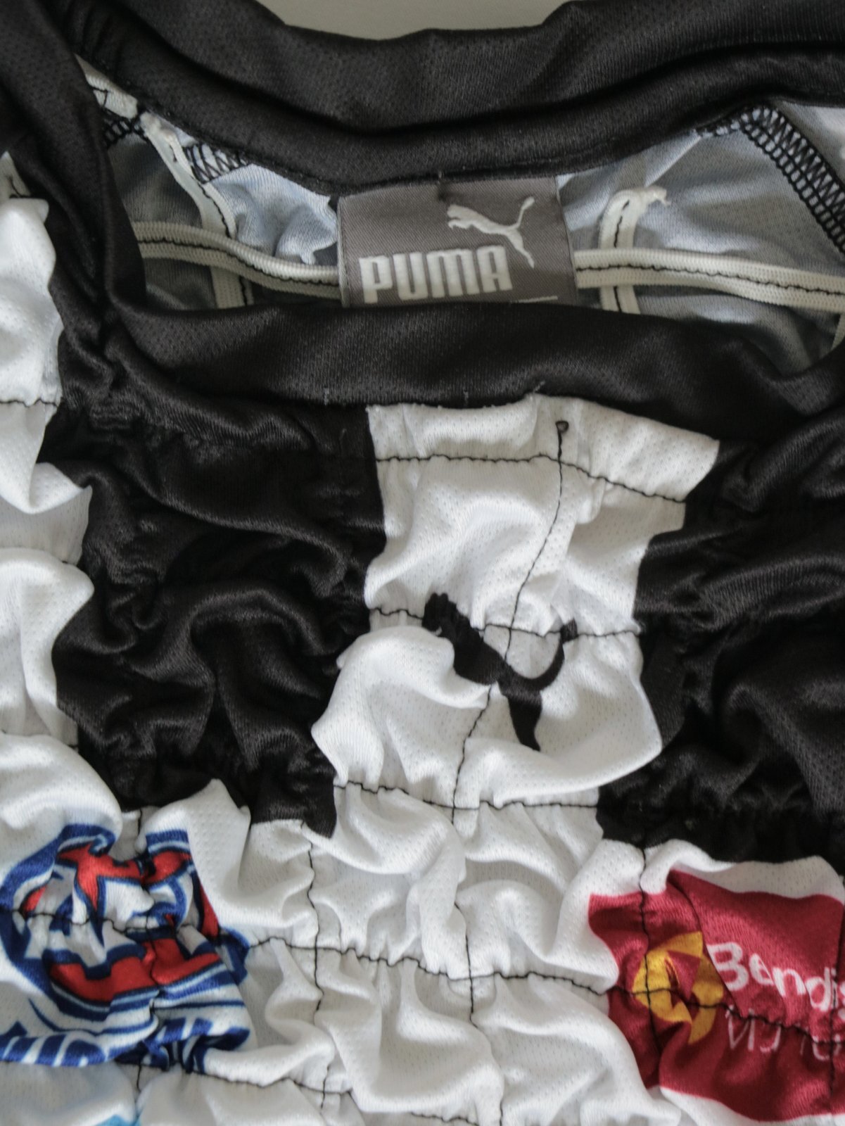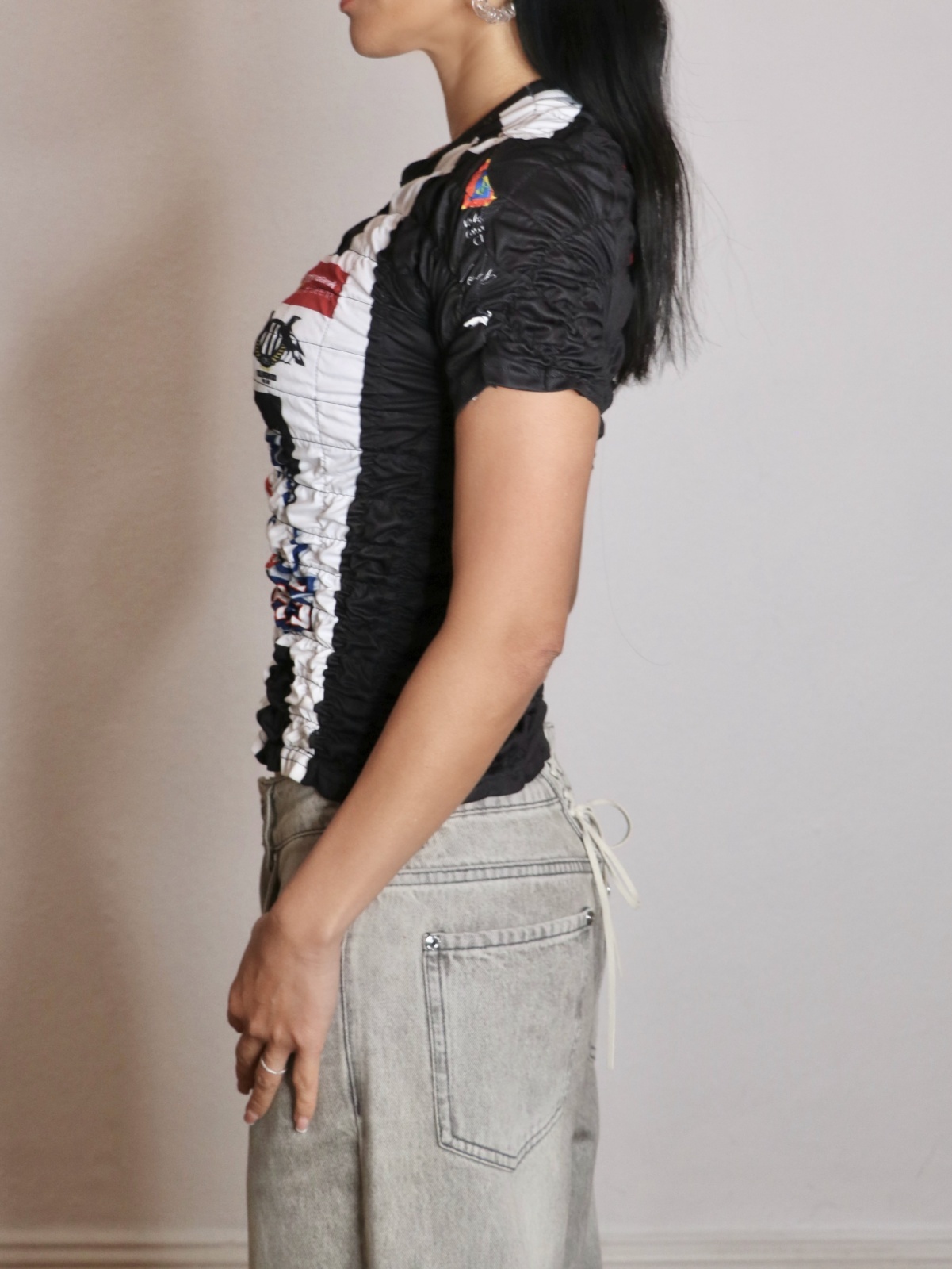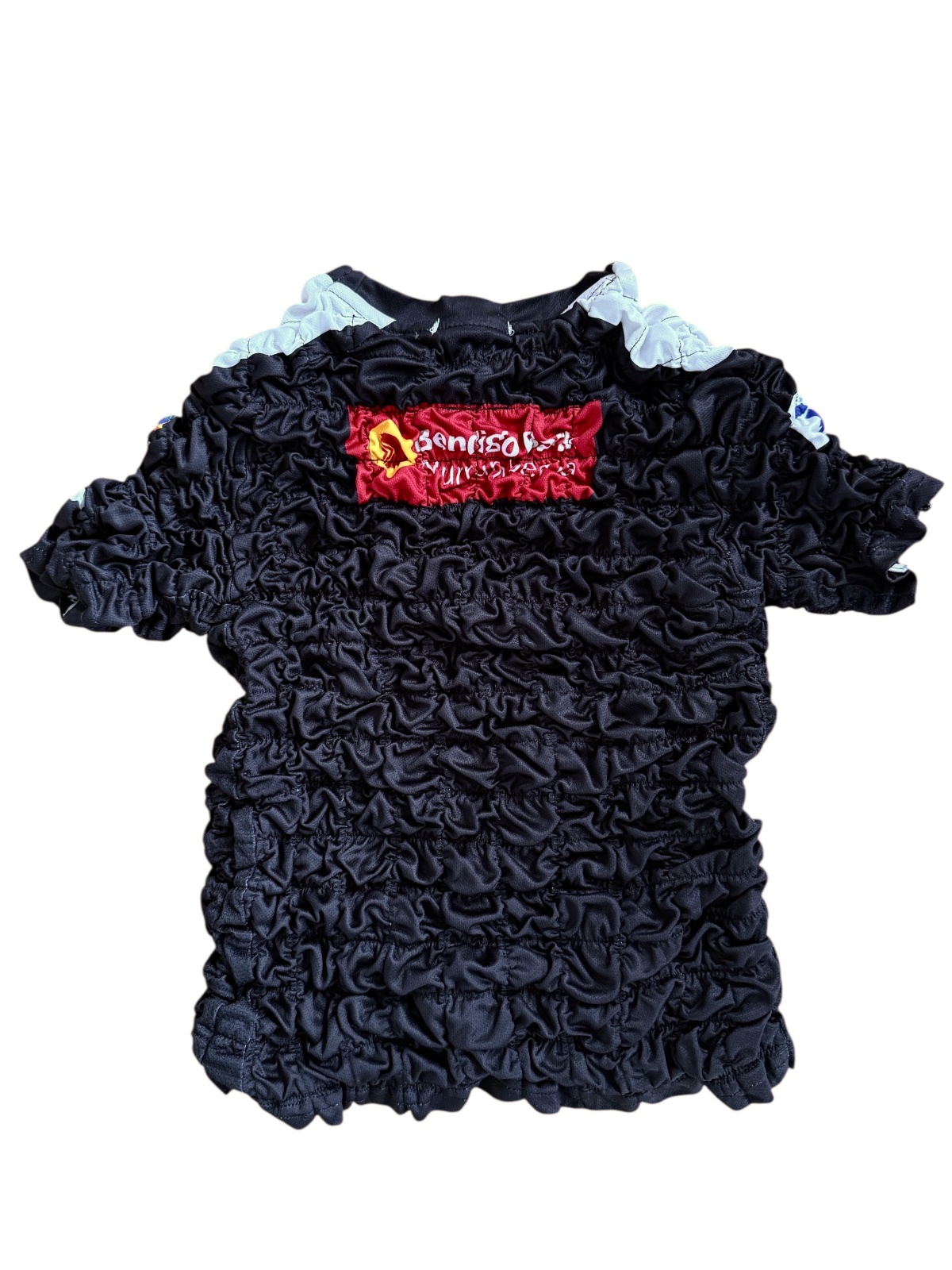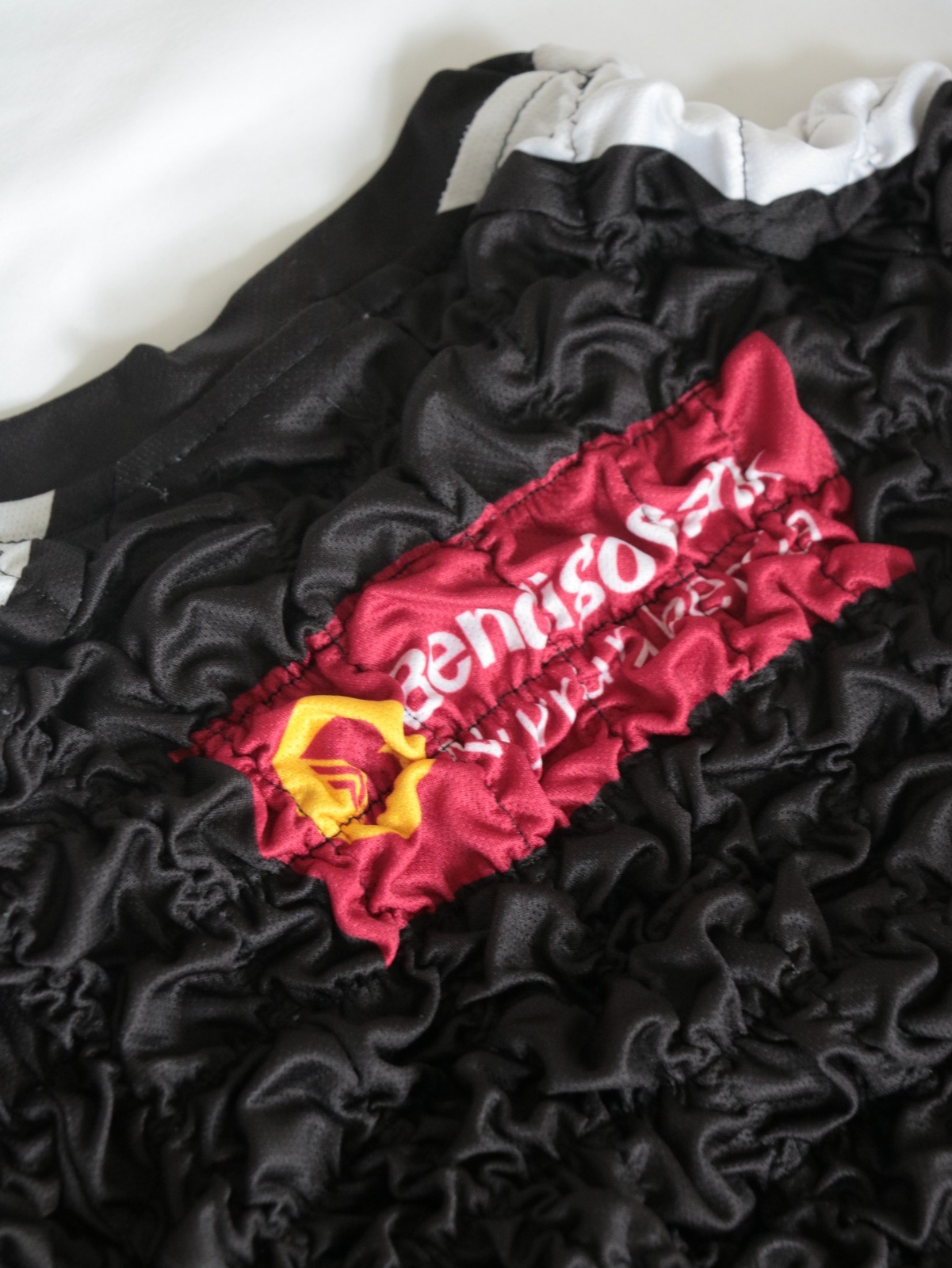 ユーズドまたは新品同様のスポーツTシャツをベースに、独自の絞り加工を施した一点物のリメイクアイテム。