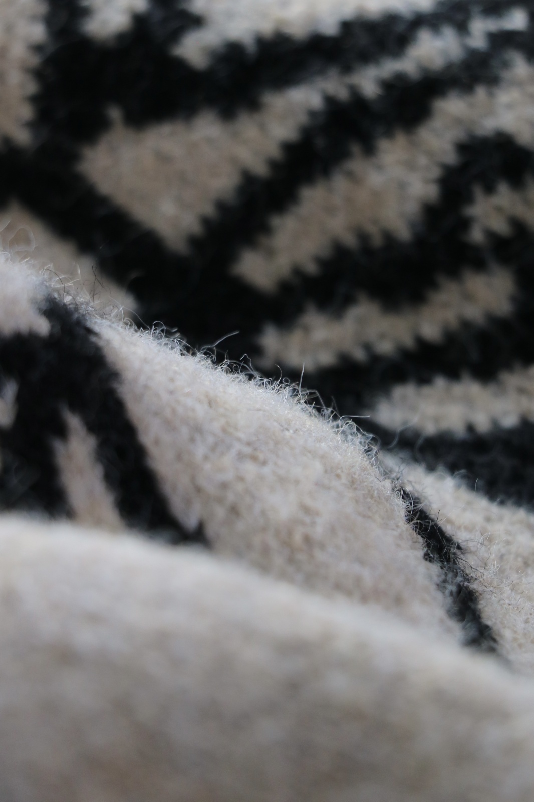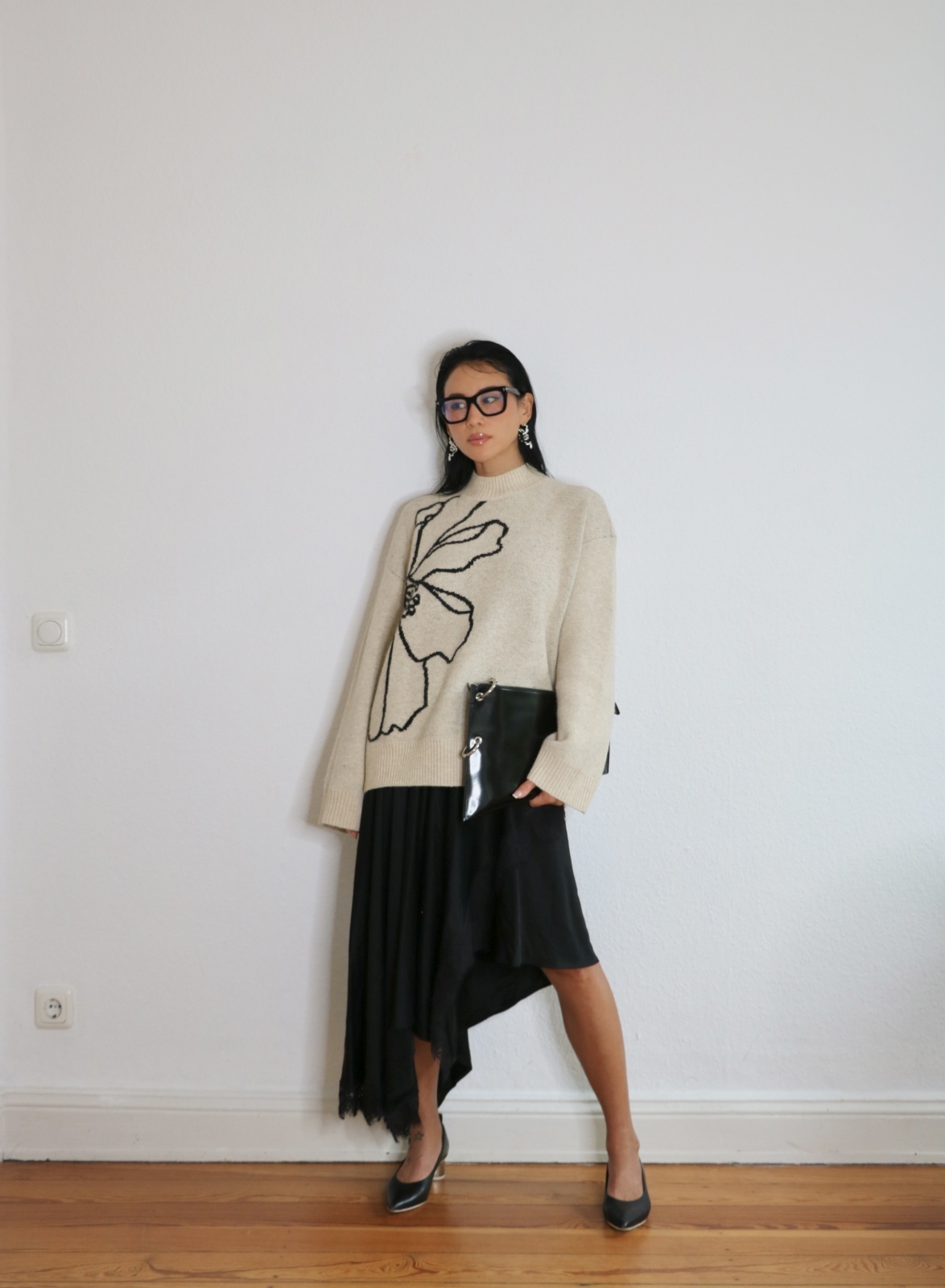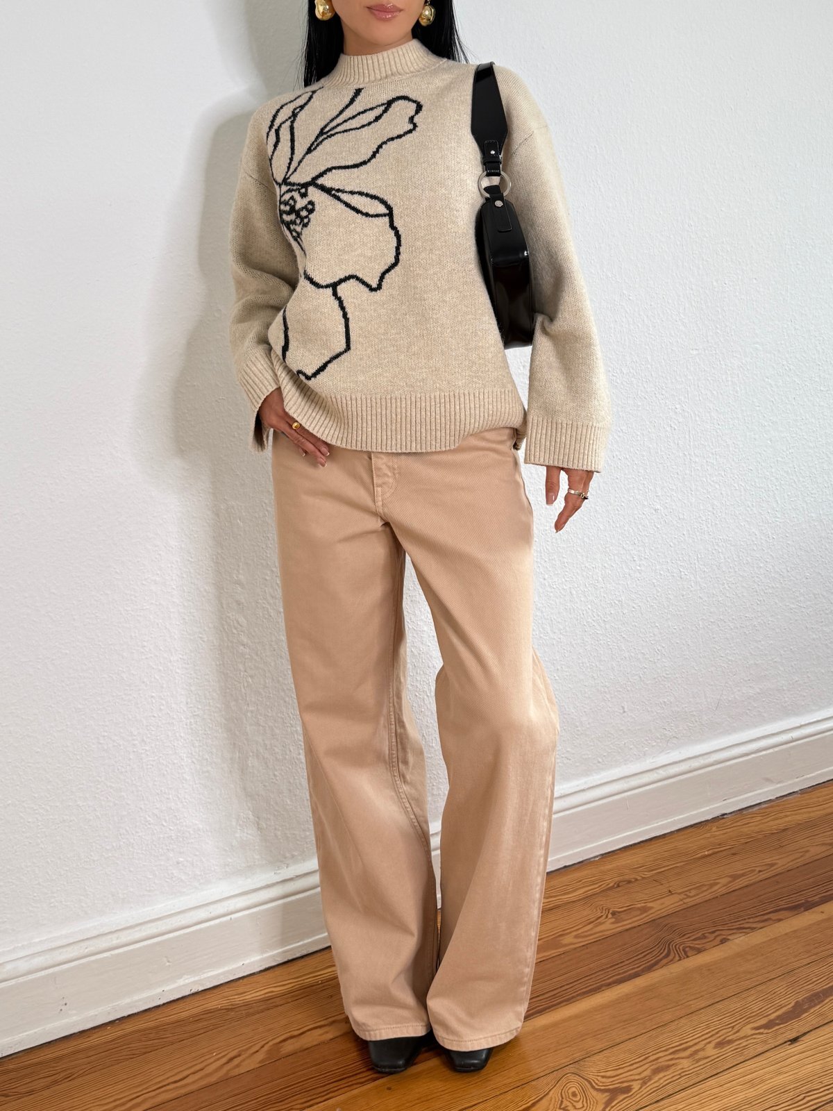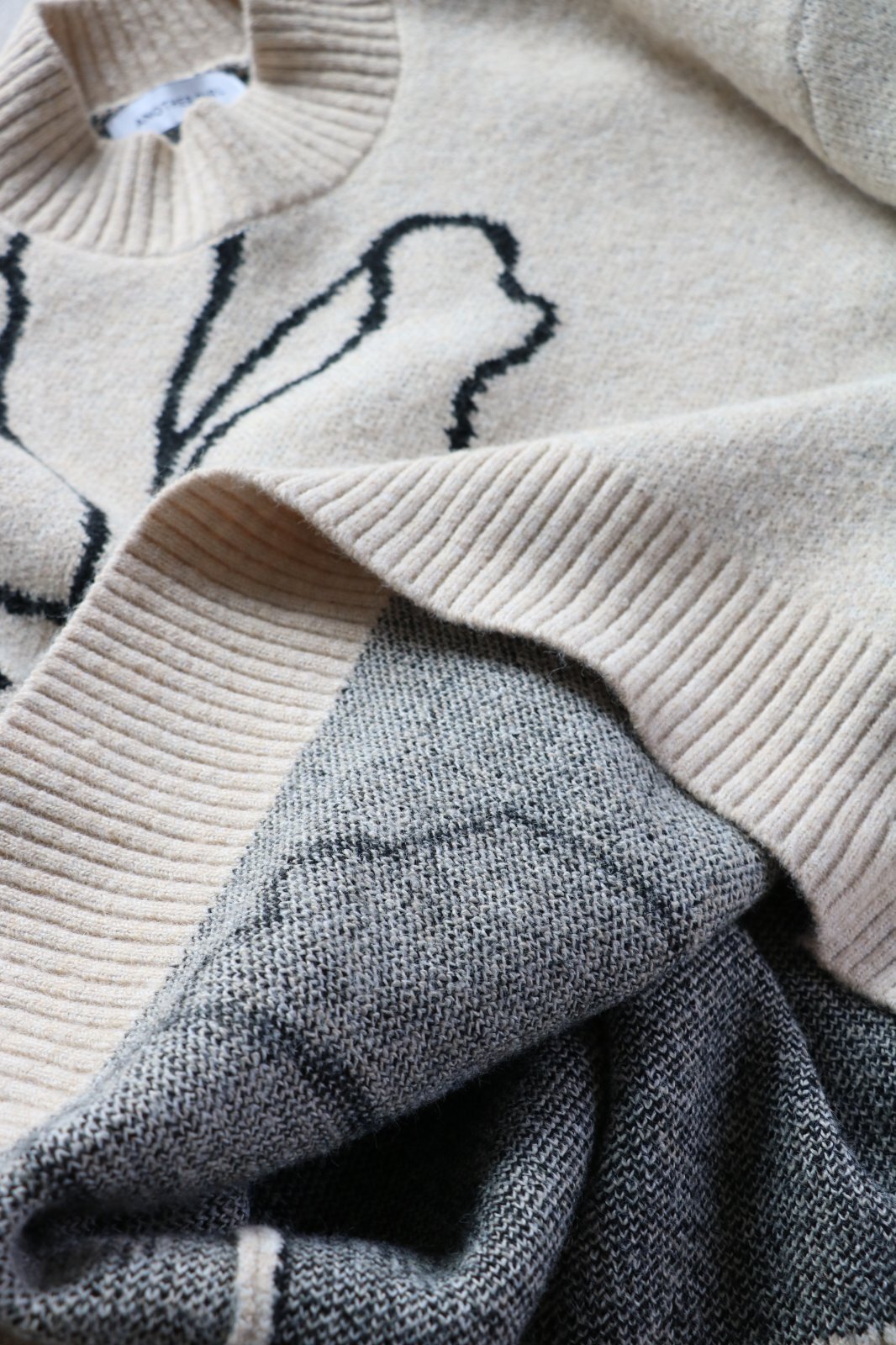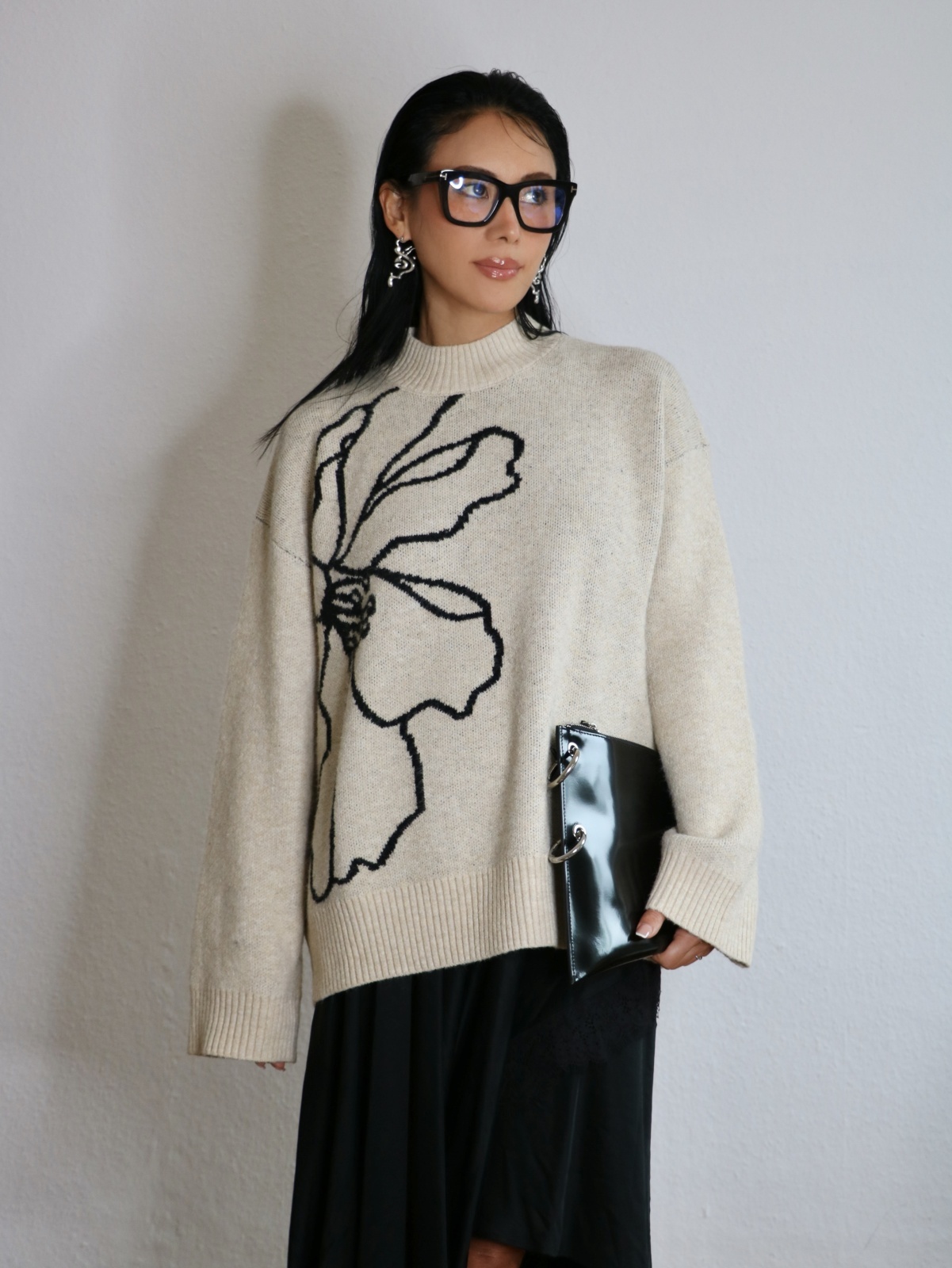 上品なクリームベージュカラーに、華やかなブラックのフローラル柄を編み込んだオーバーサイズニット。