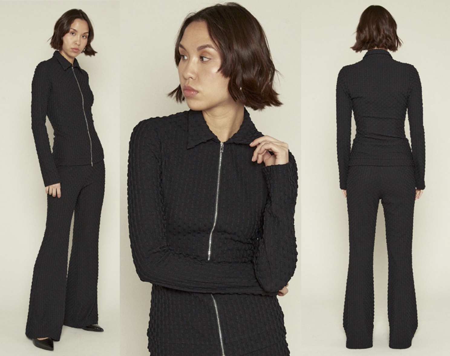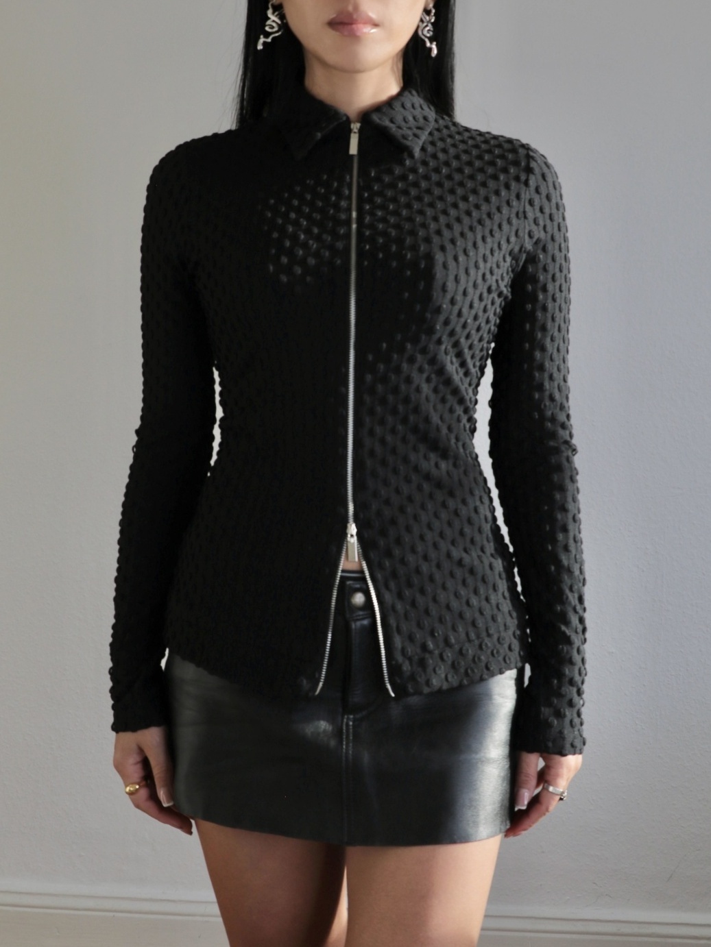 立体感のある素材がコーディネートに奥行きをプラスし、ジップを開けて羽織りにしても良し、シンプルなデザインで幅広いスタイルに活躍すること間違いなし。ブラックアイテム