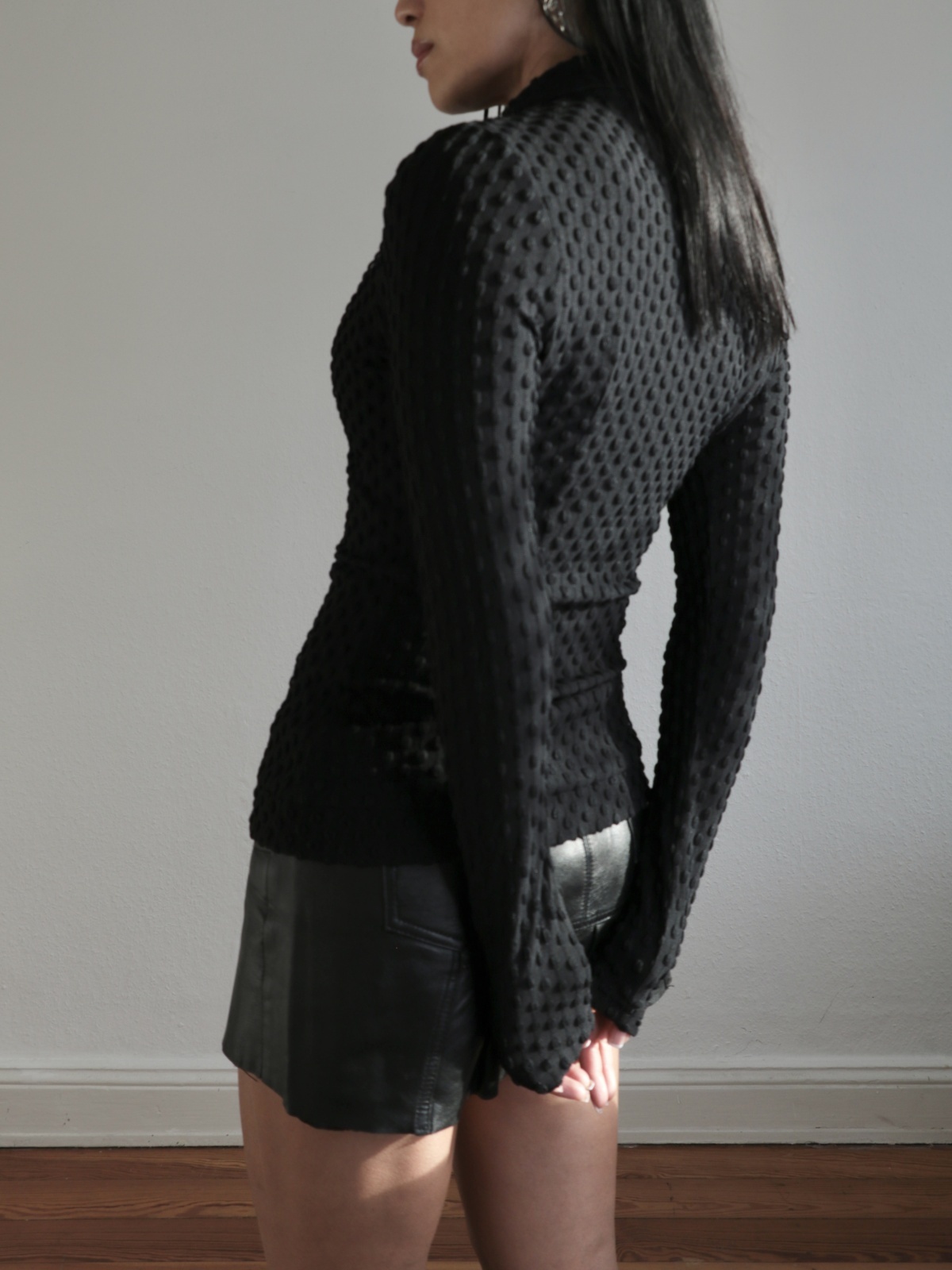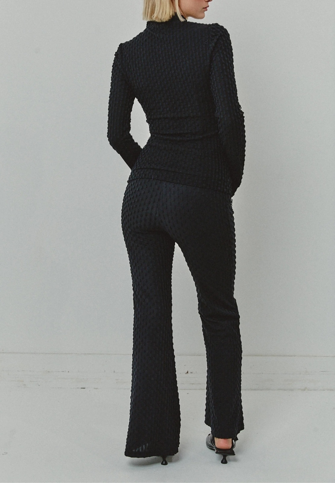 シックなテクスチャード素材で仕立てた、スタイリッシュで機能的なトップス。