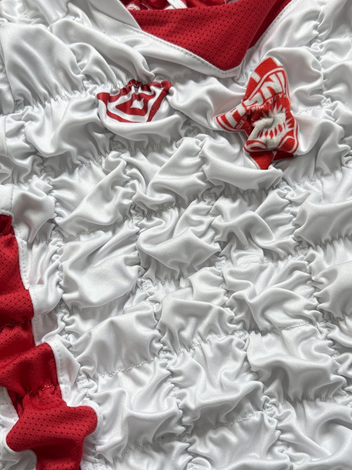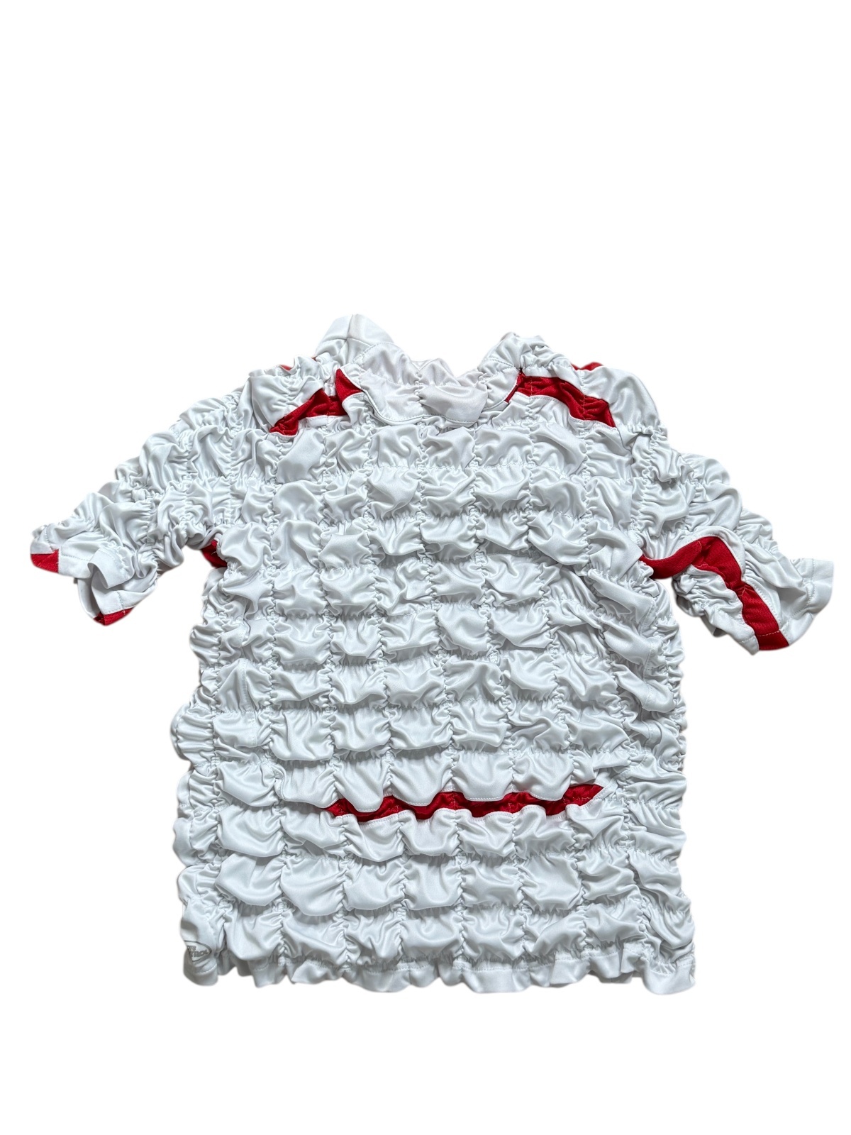ユーズドまたは新品同様のスポーツTシャツをベースに、独自の絞り加工を施した一点物のリメイクアイテム。
