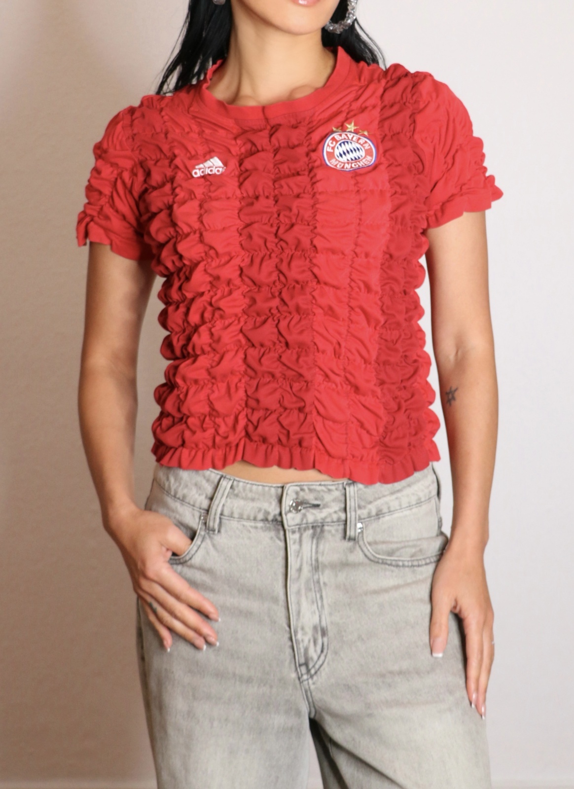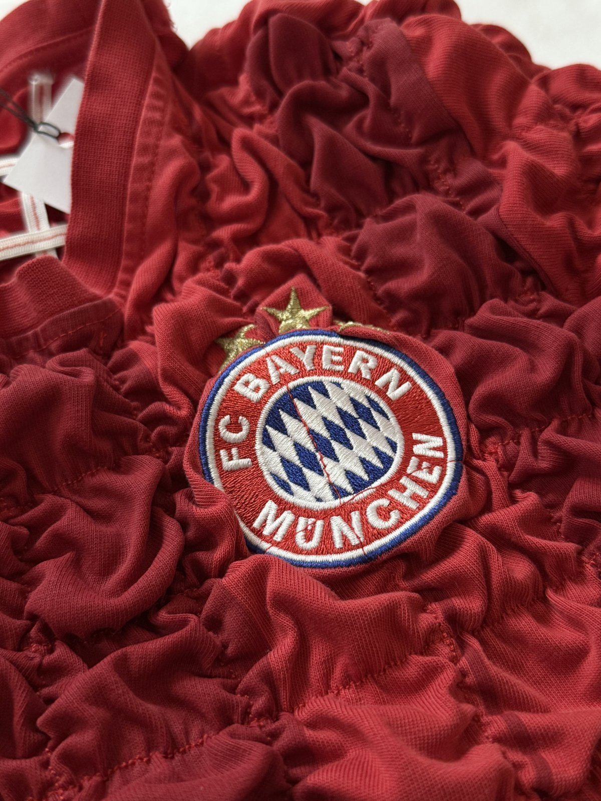 ユーズドまたは新品同様のスポーツTシャツをベースに、独自の絞り加工を施した一点物のリメイクアイテム。