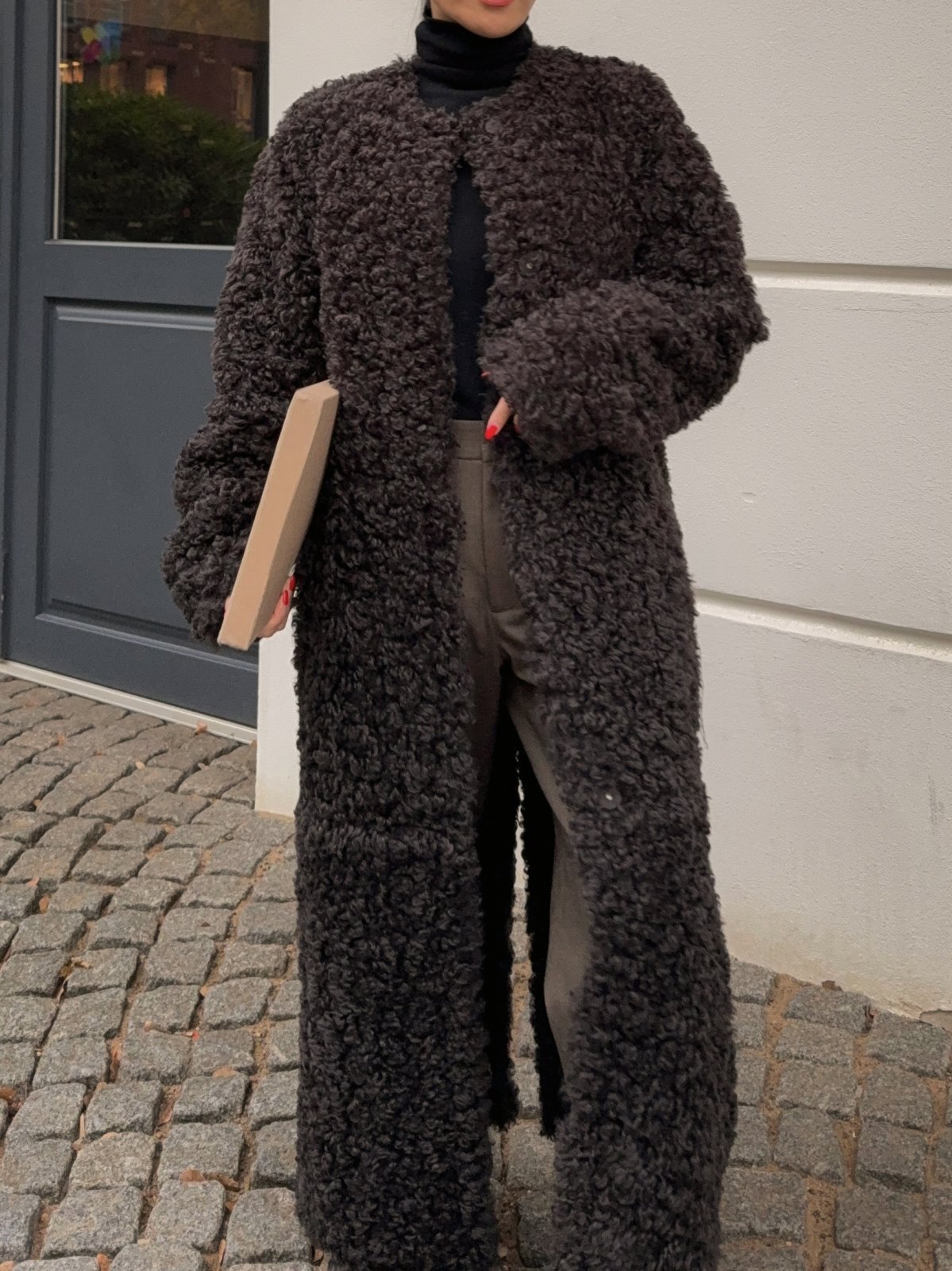 まるでプードルのような弾力のある柔らかいカーリーなエコファーで仕上げられたロングコート。