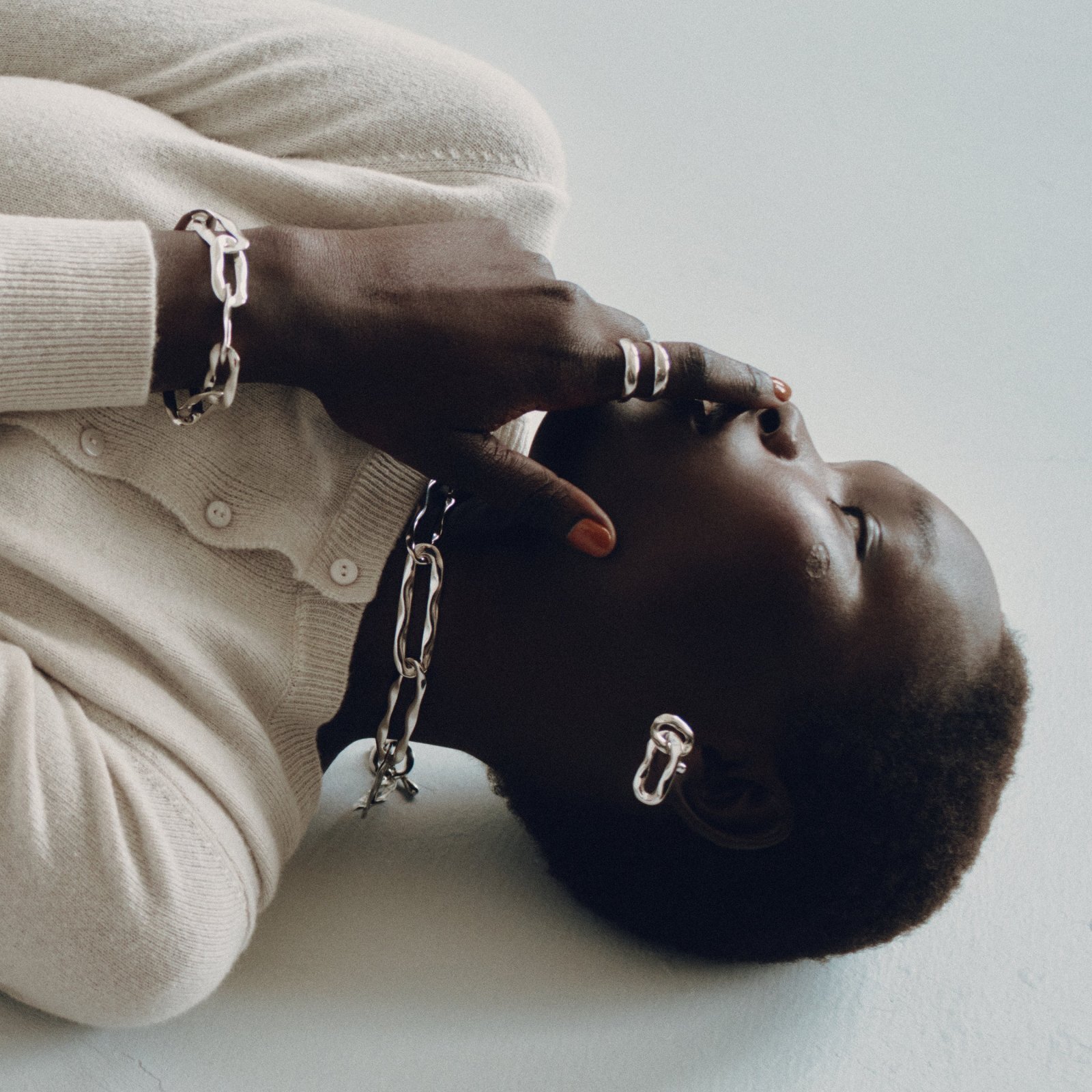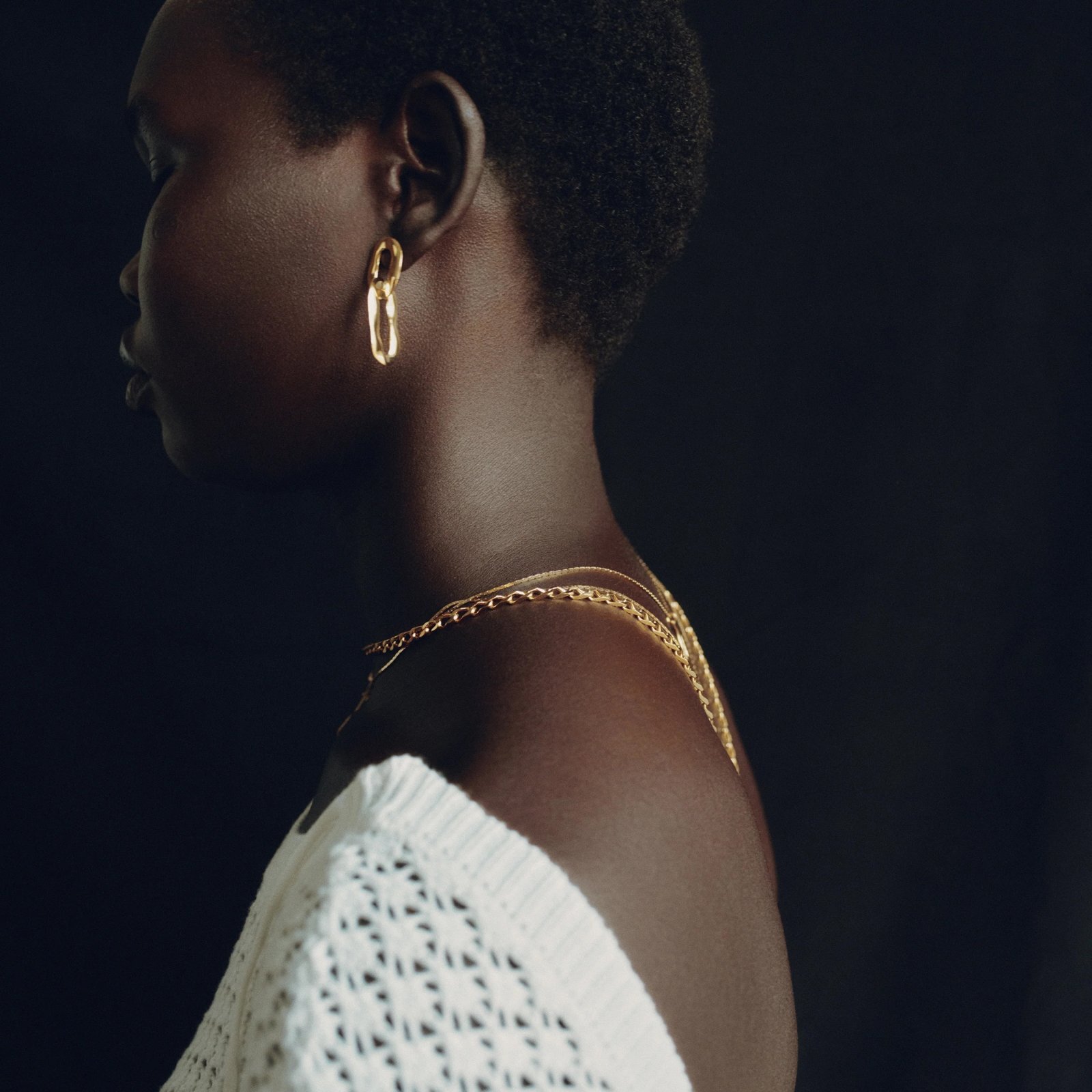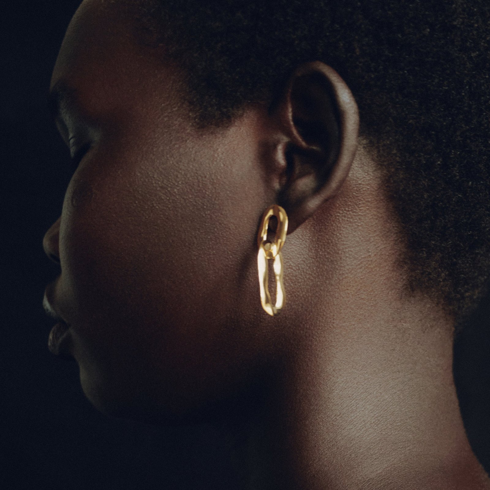 An interlocked duo of glossy, molten links suspend effortlessly from the ear. Fluid and dynamic, they move with you, catching the light from every angle. Lightweight and effortless, these beauties have quickly become a BIKO team favourite!