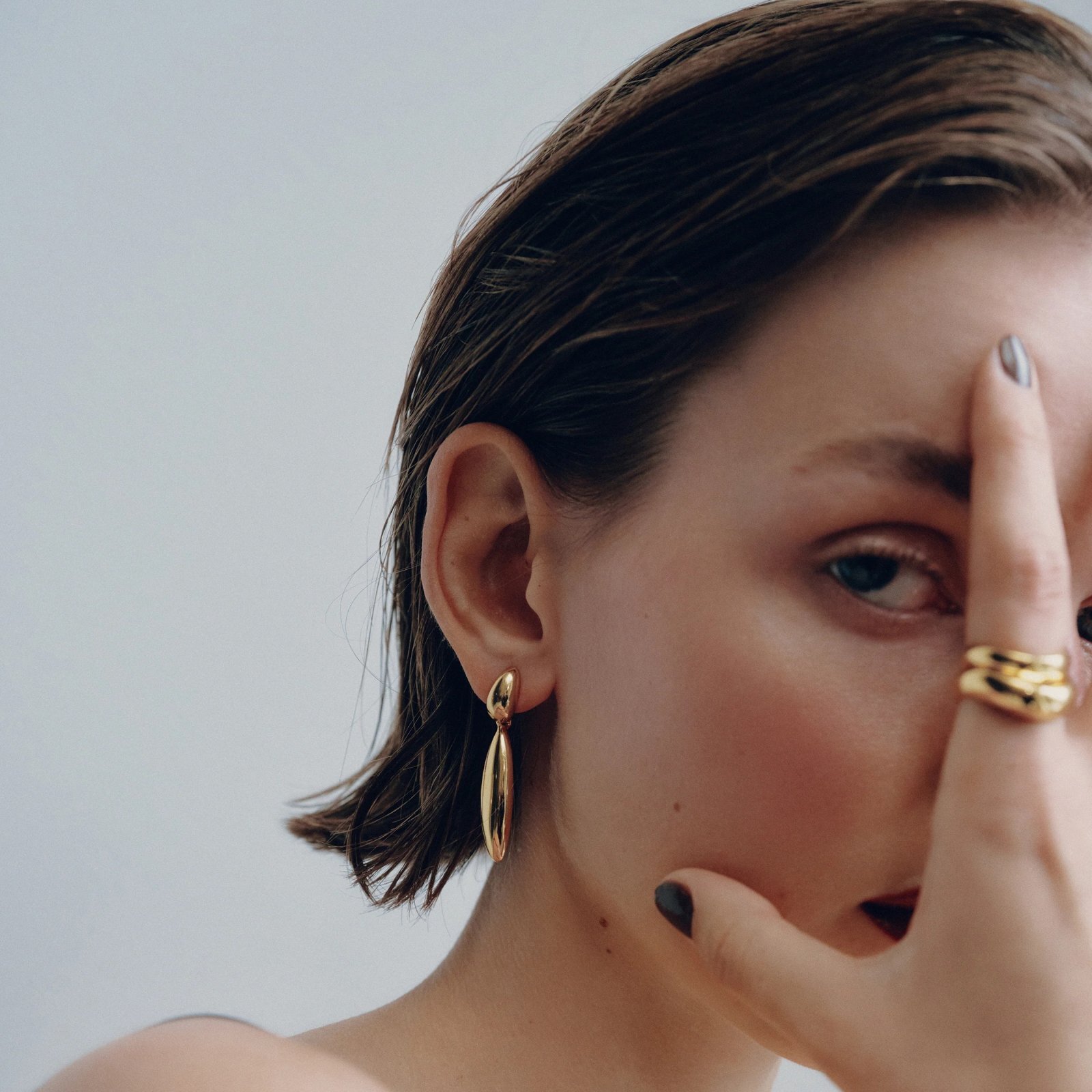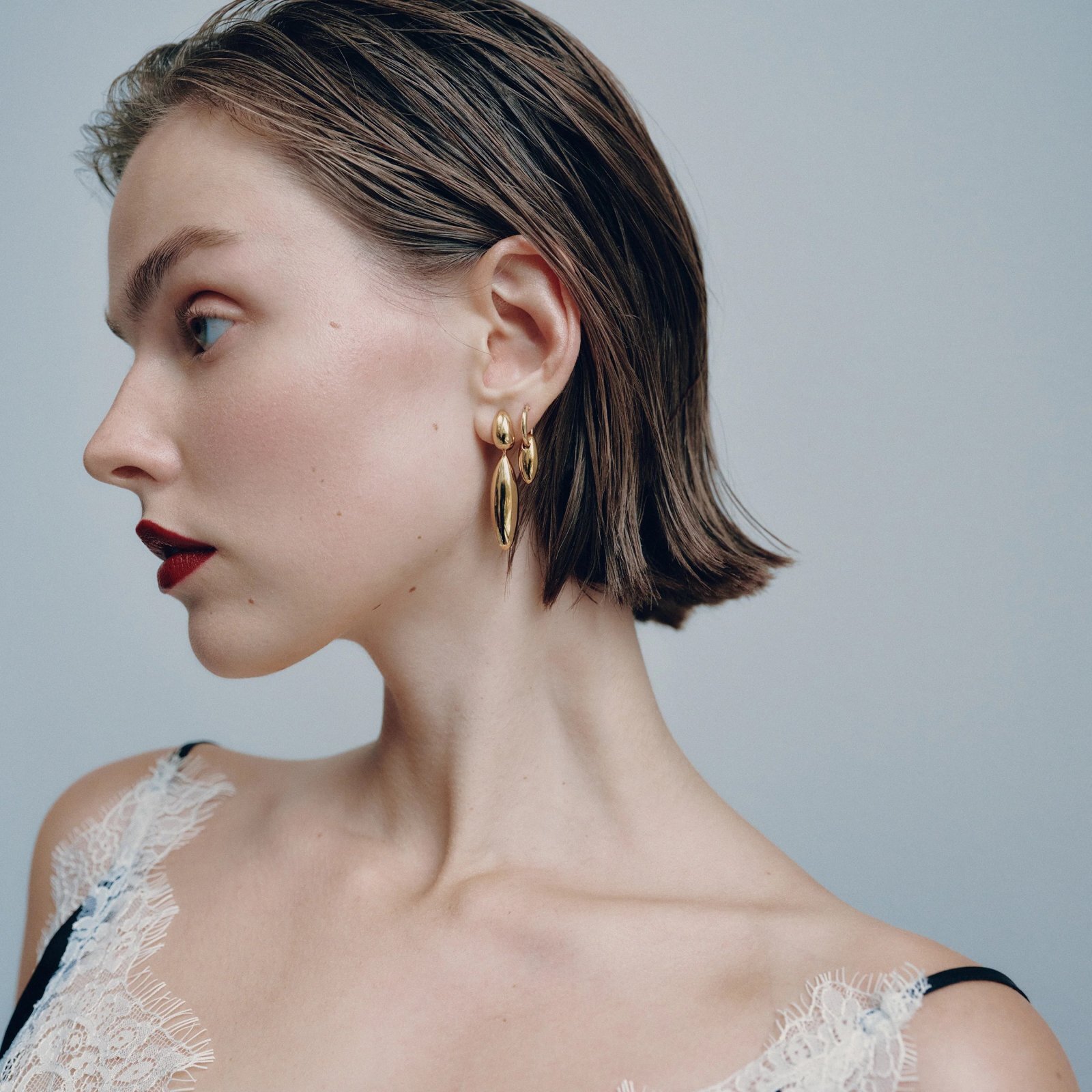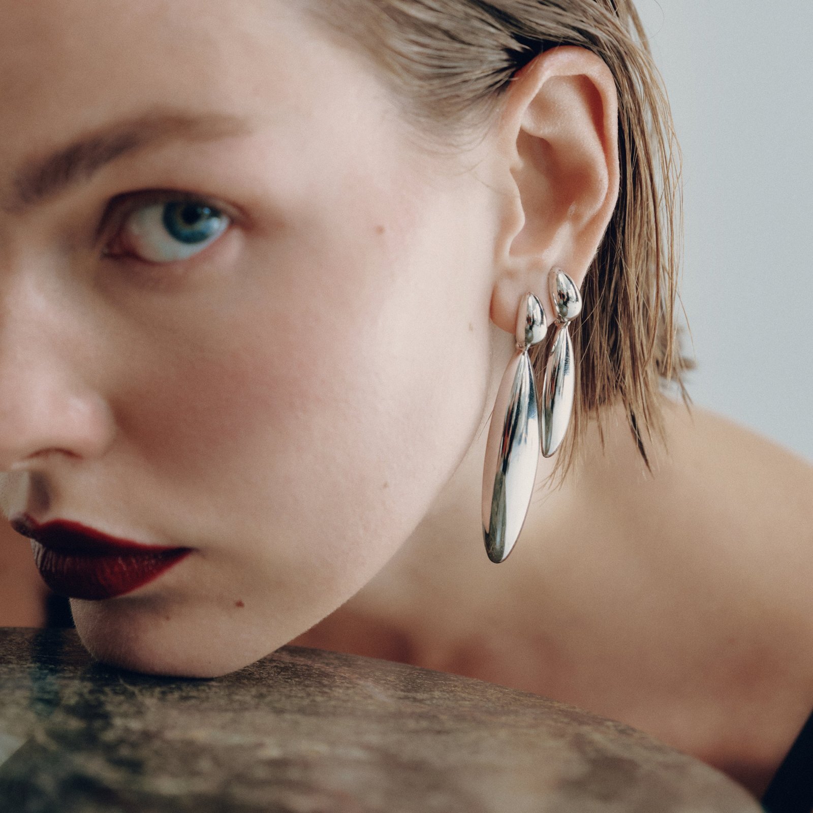 艶やかな2つのドロップが織りなす立体フォルムは、軽やかに揺れ動き、耳元に華やかさを演出します。