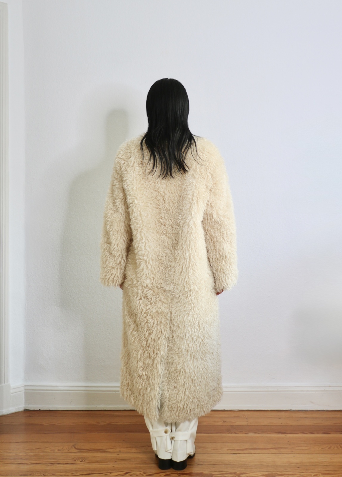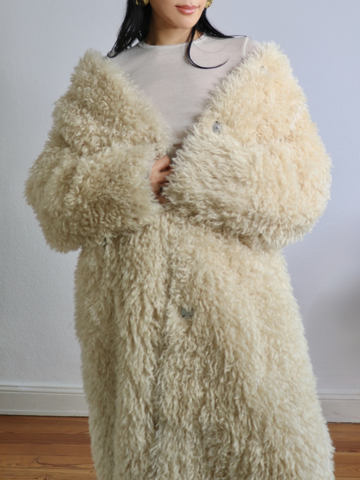 まるでプードルのようなふわふわの柔らかいカーリーなエコファーで仕上げられたロングコート。