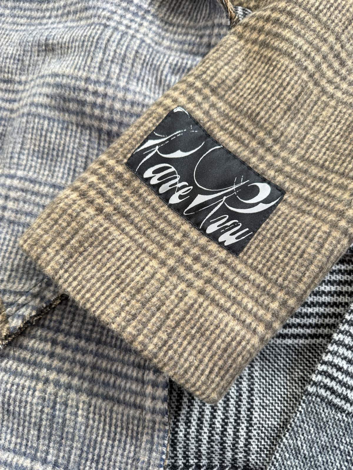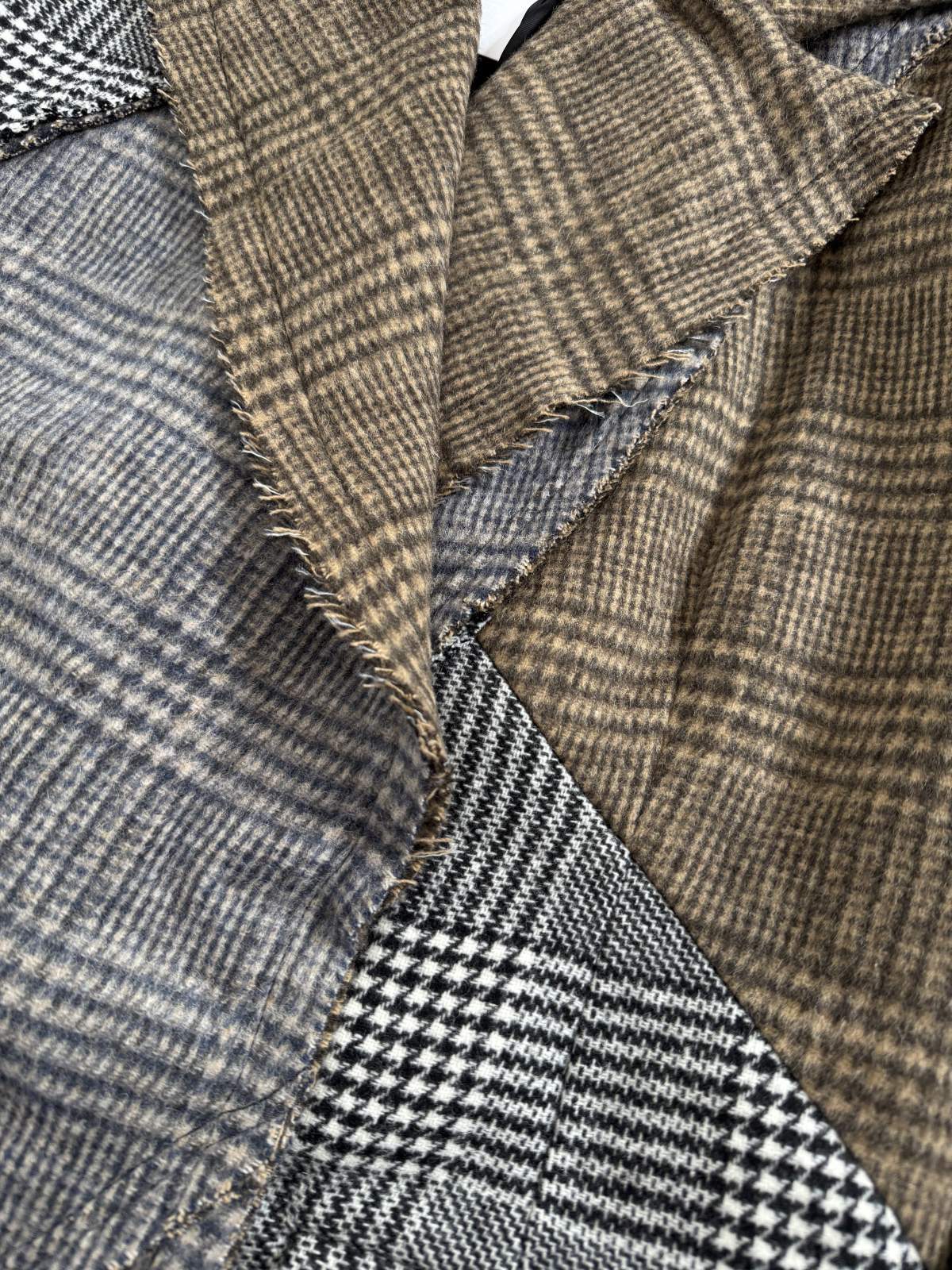 | MATERIAL/素材、材質 | Shell/表地: デッドストックのヘビ―ウールやウール混素材(複数のファブリックを組み合わせたパッチワーク) 70% Wool, 27% Polyamide, 3% Other Fibres 53% Acrylic, 28% Polyester, 19% Wool(などのパネルを組み合わせ) Lining/裏地:100% Cupro(サテン仕立て) |