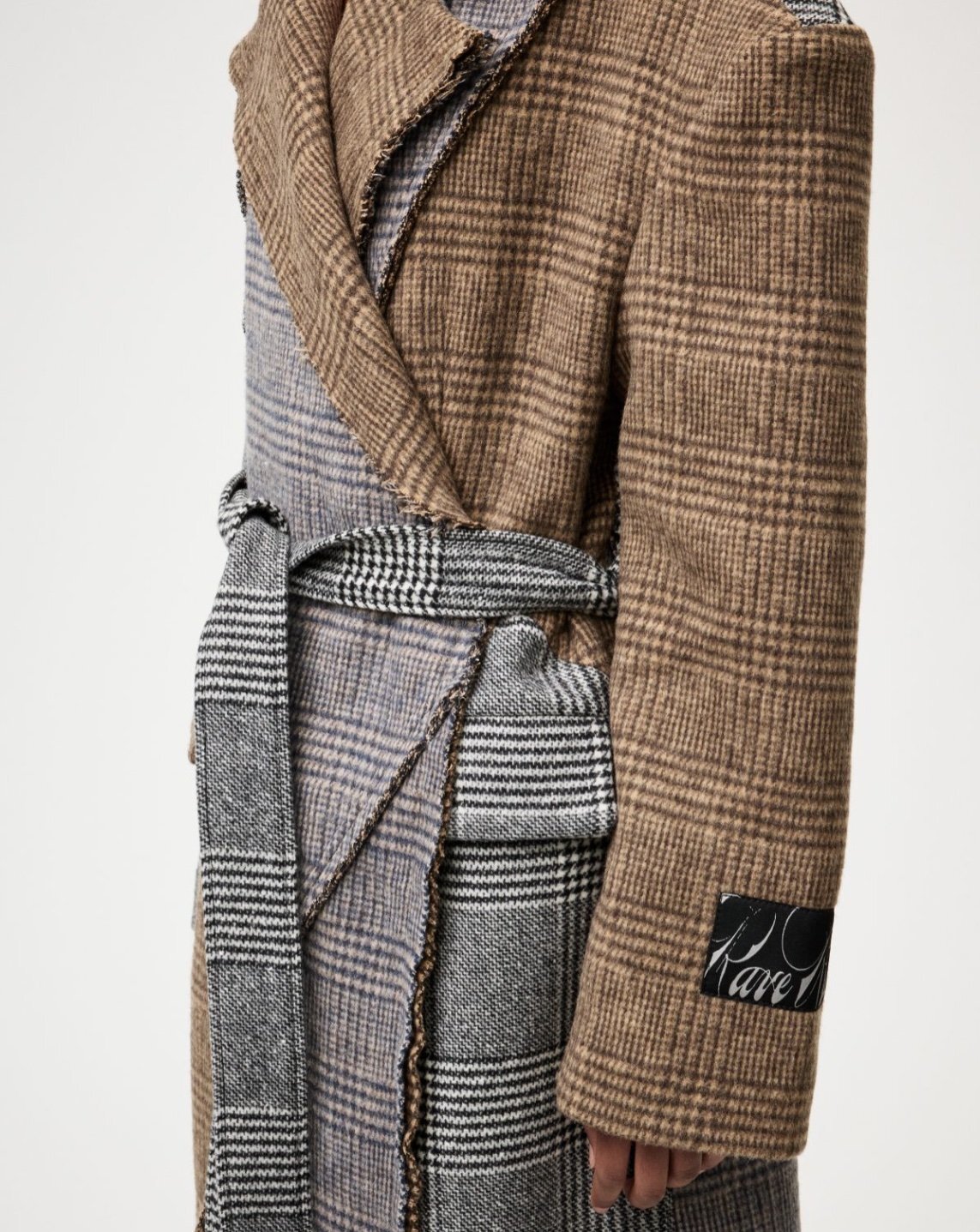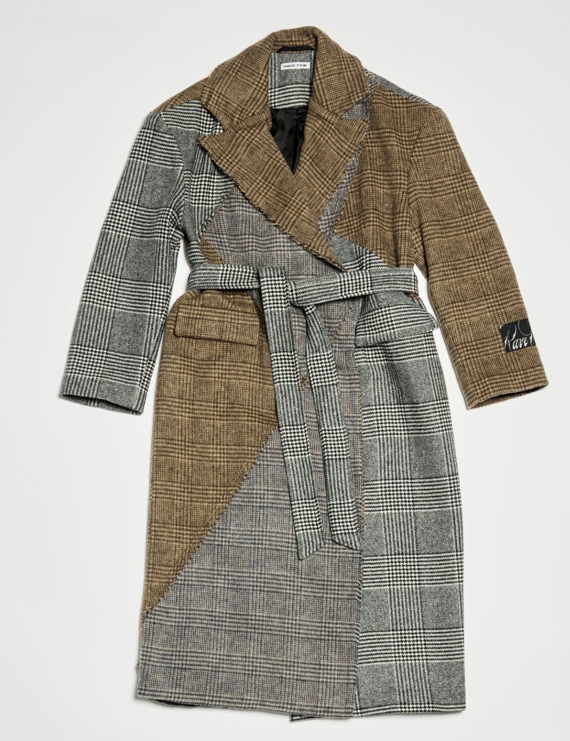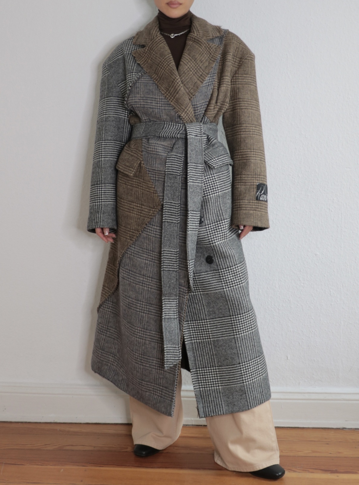 クラシックなテーラードスタイルを再解釈した、ダブルブレストのパッチワークコート。