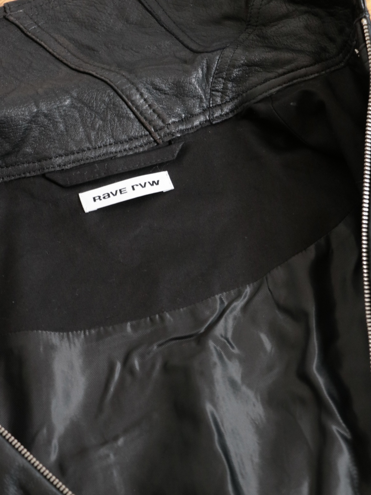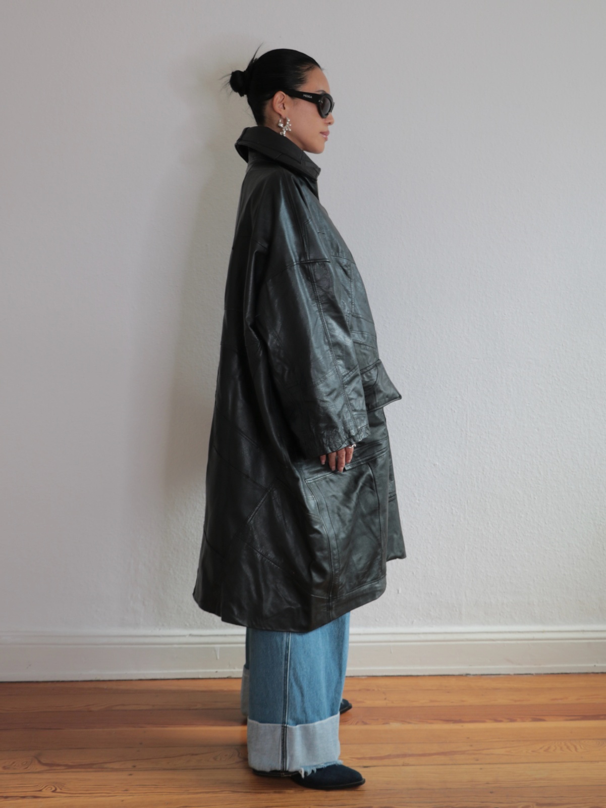 Double-layered design combining leather and wool coats.