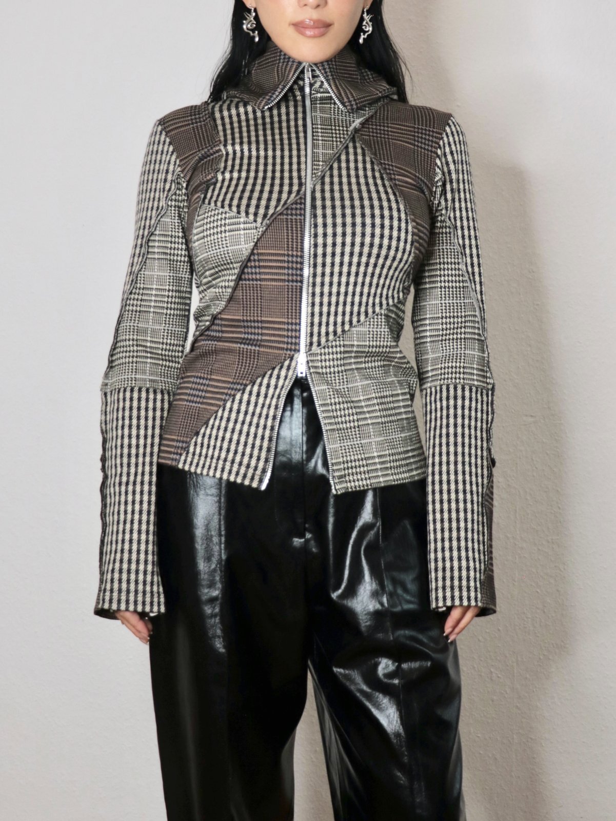 こちらはジップで調整可能なカラー&フードを備えたパッチワークニットセーターです。