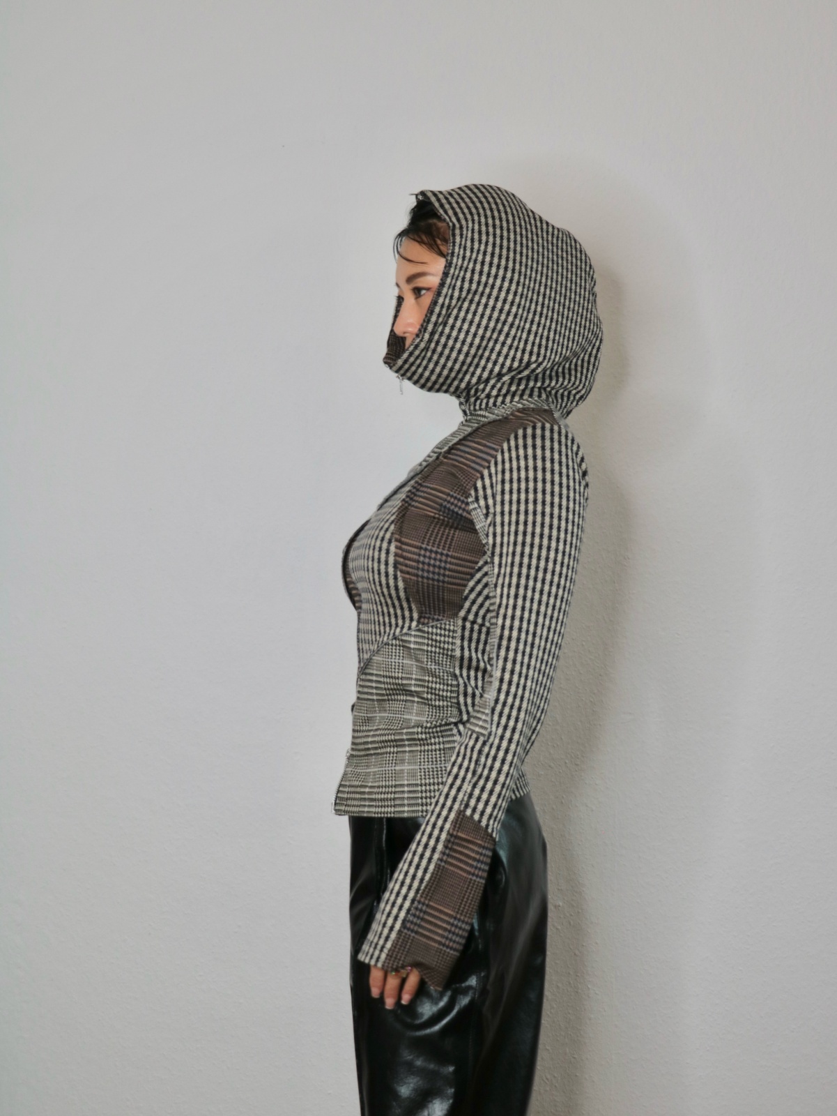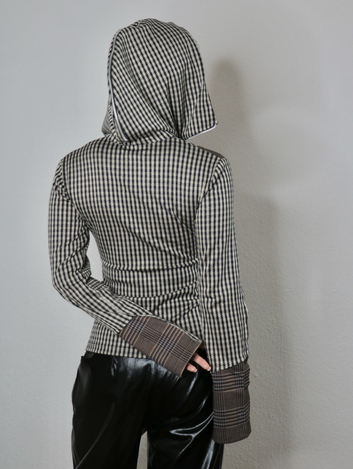 Patchwork knitted sweater featuring an adjustable collar & hood with zip.